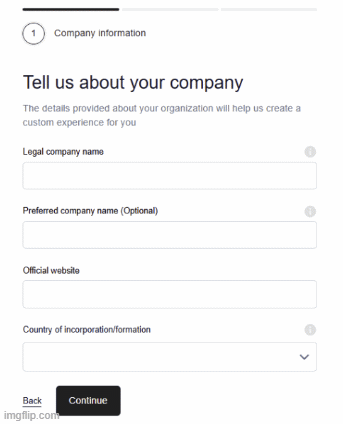 Enter your company’s legal name, website, and country of incorporation.