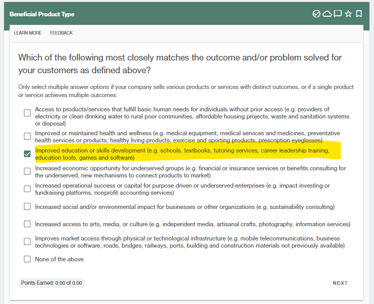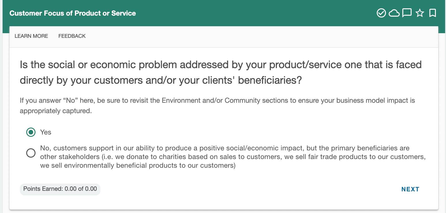 If you are considering opting into this IBM, you will have to answer specific questions about the impact of your product/service that will determine which Impact Business Models you see in your BIA. These questions, called gating questions, ensure that you see the content that is most relevant to your company in your assessment.