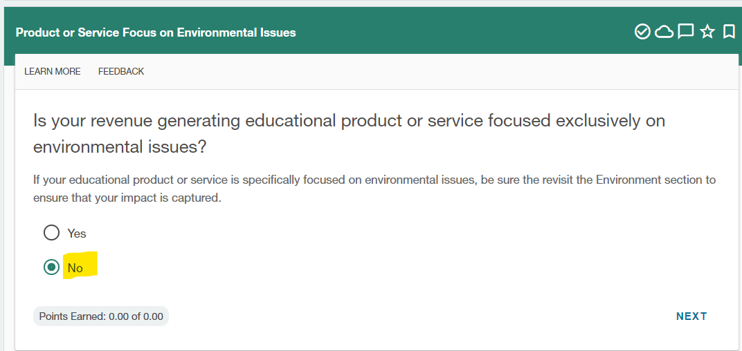 To ensure that the Education Impact Business Model shows up, answer the following gating questions as shown in the images below. Any deviation from this will prevent the Education IBM from becoming visible in your BIA.