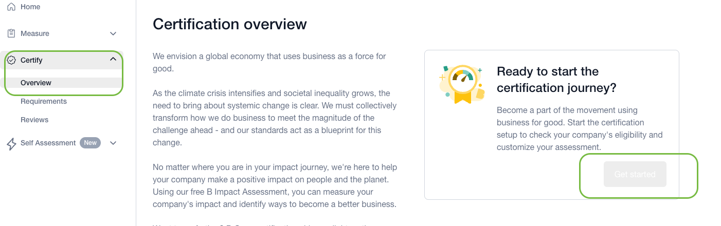 To view your progress, navigate to the Home tab on the left-hand menu. If your company is due for recertification within the next year, a banner at the top of the page will outline the steps to get started. Please note that the Certify > Requirements tab may outline some of the requirements for certification but is currently under development and may not be the most accurate place to learn about the process.