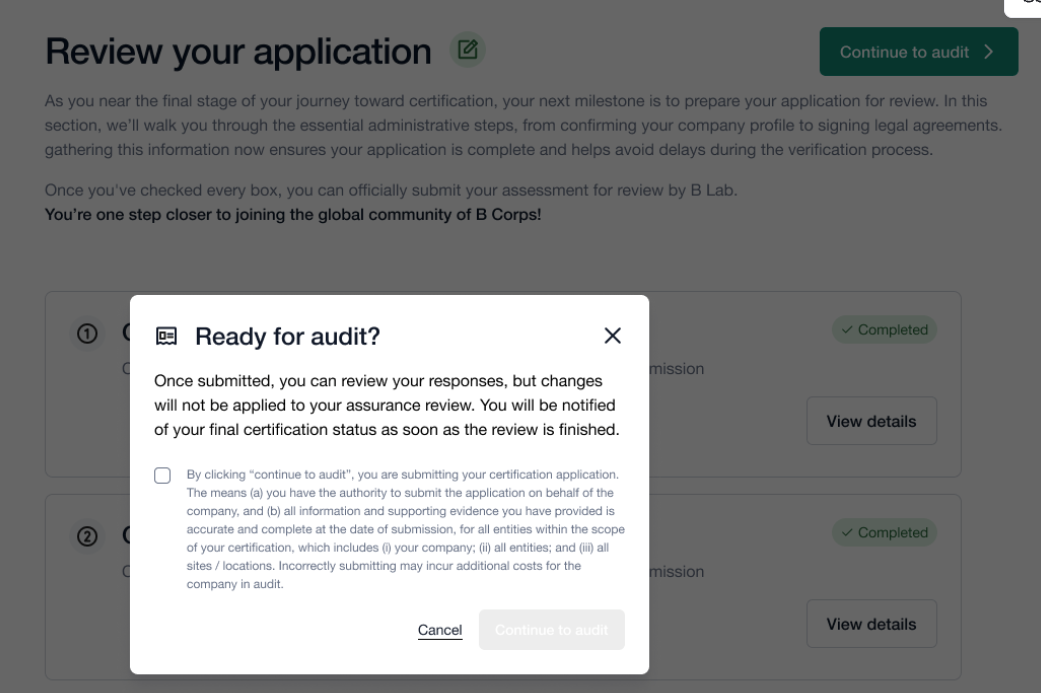 This button allows you to show your interest to complete the audit process, the process in which evidence is reviewed and verified by third party auditors.