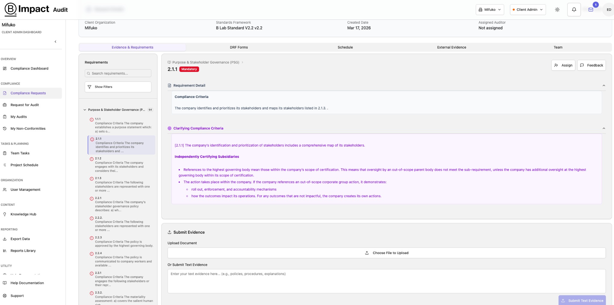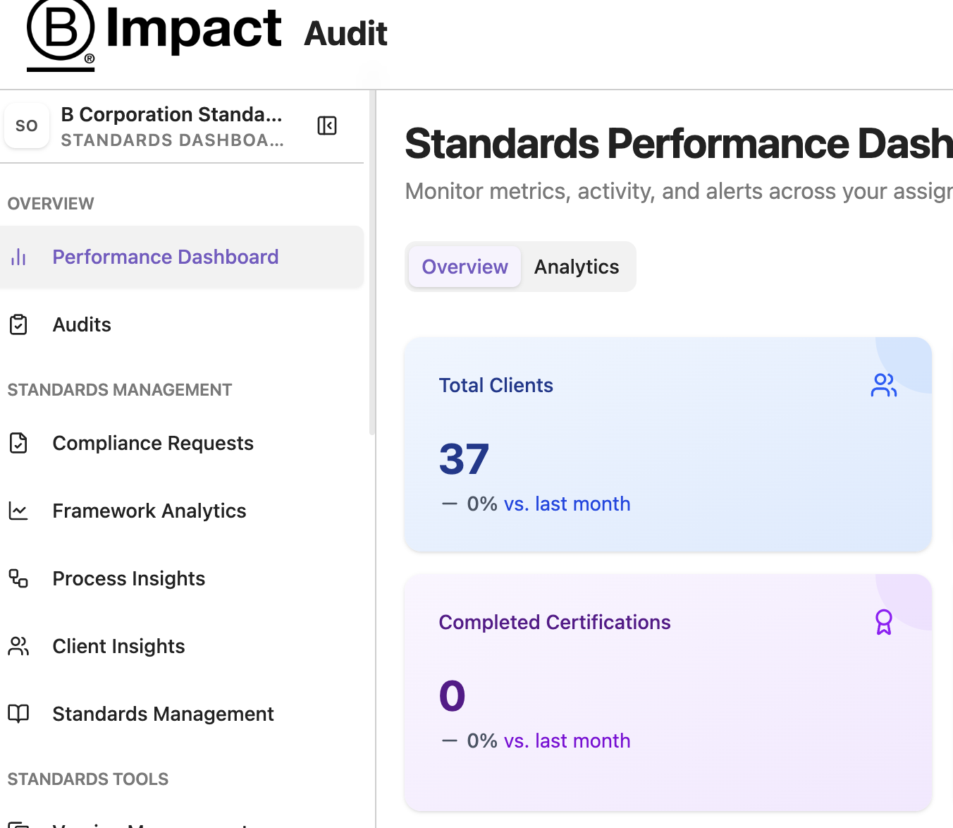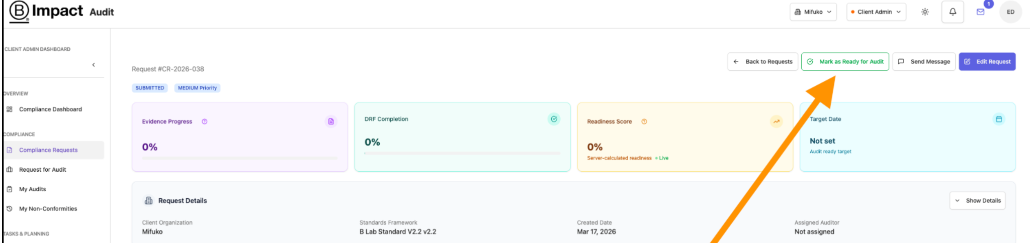 The first page on the B Impact audit section is the Compliance Dashboard page. From here, proceed to the “Compliance Request” section using the left-hand navigation.
