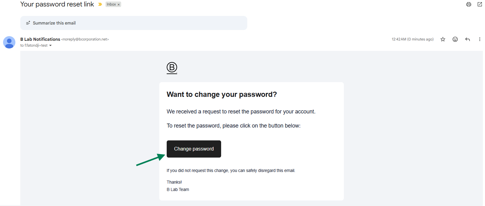 - Step 3: You will receive an email from B Lab Notifications <noreply@bcorporation.net> in your inbox with instructions to reset your password.