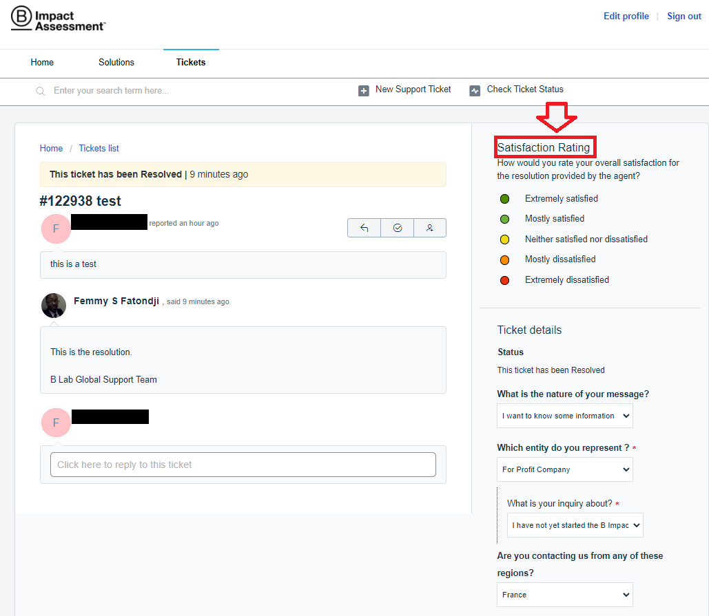 Finalmente, cuando le proporcionemos una resolución y su ticket se establezca en el estado "resuelto", se mostrará una encuesta en el panel izquierdo de este ticket.