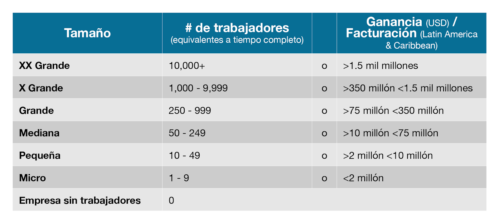 Las empresas se asignan a la categoría de tamaño correspondiente a su número de trabajadores o ingresos, lo que sea menor. Tenga en cuenta que este cambio entrará en vigor en noviembre de 2025.