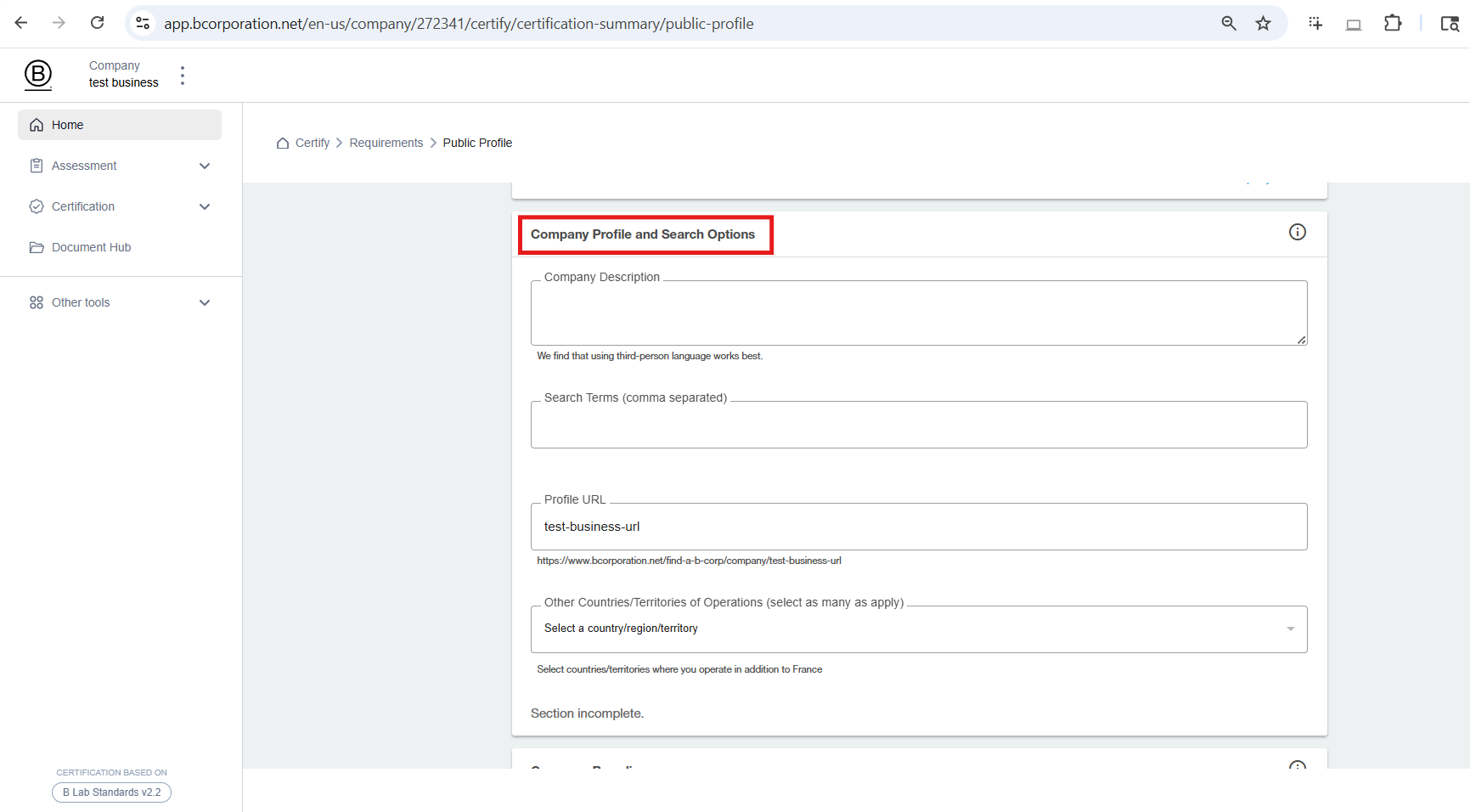 N.B.: Dans le cadre de la transition vers une nouvelle version du portail B Impact, la section des profils publics est en cours de rénovation.Pour publier ou modifier votre profil public, connectez-vous à votre évaluation d'impact B et suivez ces étapes :