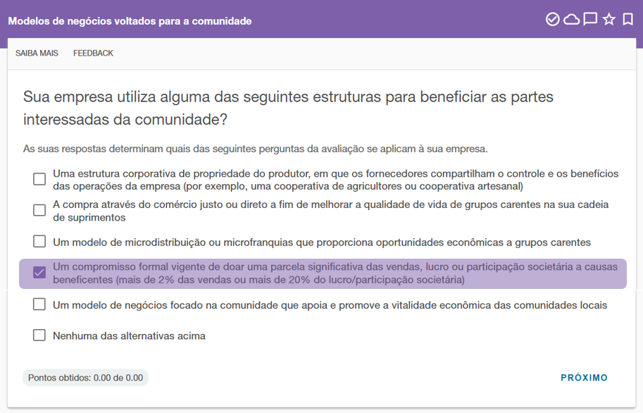 Existem três perguntas que exigem resposta afirmativa para que o MNI Modelo de Doações Filantrópicas apareça na avaliação. A primeira pergunta, “Modelo de negócios de impacto voltado para a comunidade”, requer a resposta “Sim” (não ilustrada aqui). A segunda pergunta, ilustrada na captura de tela abaixo, requer a quarta opção de resposta: “Um compromisso formal vigente de doar uma parcela significativa das vendas, lucro ou participação societária a causas beneficentes (mais de 2% das vendas ou mais de 20% do lucro/participação societária).” A terceira e última pergunta-gatilho, “Compromisso formal com um modelo de doações filantrópicas”, também requer a resposta “Sim” (não ilustrada aqui).