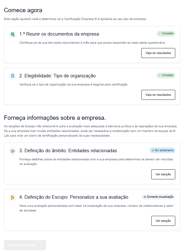 Se sua empresa pretende obter a certificação, a Configuração de Certificação orientará você por meio de um questionário curto e personalizado. Ao preenchê-lo, você fornece informações essenciais sobre sua empresa para que o B Lab possa: