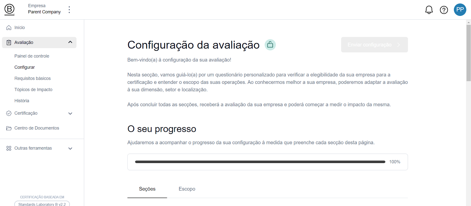 Assim que você enviar a Configuração da Certificação, um resumo do escopo de certificação será gerado na aba “Escopo”, apresentando o escopo e o track da sua empresa, com base nos resultados das Seções 3 e 4.